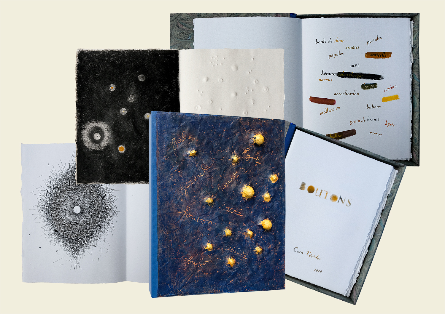 – 2026 Coco Téxèdre Boutons – 2025 Coco Téxèdre La femme parfaite, François Rabelais Les dentelles de Thélème, Coco Téxèdre La chanson du carillonneur, François Rabelais ce qu’on me dit, Victor Hugo Les contemplations, Coco Téxèdre Mort de rire – 2024 François Rabelais Canicule, Daniel Leuwers L’ode à Coco Téxèdre, Coco Téxèdre et couic, François Rabelais Nous ne faisons que rêvasser, Coco Téxèdre La bordure verte, François Rabelais Avait plus d’un tour dans son sac – 2023 Coco Téxèdre La chute, François Rabelais A la tirelitentaine, Coco Téxèdre Mémots Coco – 2022 François Rabelais au cas où tous les livres périraient, Coco Téxèdre Rabelais, Coco Téxèdre Soldes, François Rabelais Mille pertuis, Coco Téxèdre 1 2 3 Soleil, Francis Ponge Personne d’ailleurs, Coco Téxèdre Femme dans l’ordre des choses, Coco Téxèdre A force de tuer le temps, Coco Téxèdre Intervalle 12 punitions, François Rabelais Cy n’entrez pas – 2021 Nicolas Gaislin Boire la tasse, François Rabelais Pieds de porc, François Rabelais Passeport vaccinal, Guillaume Apollinaire L’adieu (Hommage à G), Gilbert Lascault ça gigote, ça remue – 2020 Coco Téxèdre Pandémie, Jacques Offenbach La touche noire, Paul Verlaine L’amour, Coco Téxèdre Compter les moutons, François Rabelais Vive la rôtisserie, Franz Liszt Deux mètres de musique, François Rabelais Le poumon, François Rabelais Salade d’andouille, Coco Téxèdre Rebuts, François Rabelais Du blé en herbe, Paul Valéry L’abeille, Coco Téxèdre Indéchiffrable, François Rabelais Notre pain quotidien – 2019 Suzanne Aurbach Sable, Coco Téxèdre Du côté de la terre, Suzanne Aurbach Arbre, Coco Téxèdre Motivo Ricamo, François Rabelais Paroles gelées, Denis Wetterwald Lacs et Entrelacs, Jean de La Fontaine Le chêne et le roseau – 2018 Coco Téxèdre Un arbre, Coco Téxèdre La récitation, Joachim Du Bellay Sonnet des regrets, Laurent Grison Hélice, Catherine Bankhead Forêts secrètes – 2017 Coco Téxèdre Le piéton, François Rabelais Pas jeunes, Laurent Grison Cil docile, François Rabelais Les jeux de Gargantua – 2015 Daniel Leuwers Stances à leurs corps, Laurent Grison La langue de l’entrelacs, Lydie Bader Réminiscences, Laurent Grison Vers l’hors-dans, Gilbert Lascault Chahut Chaos – 2014 Michaël Glück Comme un livre du voir dit, Paul Valéry Heure, Coco Téxèdre Des clous, Coco Téxèdre Le sein dessein, François Rabelais Fol, St-John Perse Vents, Daniel Leuwers Petits poèmes au secret – 2013 Coco Téxèdre Herbe rouge, Coco Téxèdre Tiré par les cheveux, Dominique Sampiero Hautes Herbes, Coco Téxèdre Herbier, Suzanne Aurbach traduction Roseann Bell Herbe-Grass, Coco Téxèdre Encyclopédie de la ménagère de plus de 50 ans – 2012 Coco Téxèdre L’herbe du dehors – 2011 Suzanne Aurbach Archéologies, Suzanne Aurbach Prise de tête (Tic Toc), Coco Téxèdre Con séquence, Honoré de Balzac Le chef-d’œuvre inconnu – 2010 Pierre de Ronsard Vermeillette fante, Suzanne Aurbach Le fil de soi 1 & 2, Coco Téxèdre Coloriage – 2009 Coco Téxèdre Plume d’encre qui se prend, François Rabelais Les dessous de Thélème, Georges Braque St-John Perse Coco Téxèdre Dialogue – 2008 François Rabelais Le Pantagruélion, Coco Téxèdre Brèves d’atelier, Albert Camus L’état de Siège – 2007 Albert Camus Le mythe de Sisyphe, Coco Téxèdre Espèce menacée, Coco Téxèdre Grand Genévrier, Coco Téxèdre Froid & Multitude – 2006 Coco Téxèdre Sauve qui peut, François Rabelais La coupe testée – 2004 Suzanne Aurbach Ribambelles, Coco Téxèdre Fil de fer – 2003 Coco Téxèdre Le quotidien, Coco Téxèdre Le beurre – 2002 Coco Téxèdre Trésor de guerre, Coco Téxèdre La maladie des autres – 2001 Coco Téxèdre Parce que là ce n’est pas vraiment ici, Coco Téxèdre Les petites pensées, Suzanne Aurbach Corps Ange – 2000 Coco Téxèdre Coupe de cerveau bac + 8 – 1998 Coco Téxèdre Etre ficelle, Coco Téxèdre Six tranches de peint – 1997 Coco Téxèdre La fenêtre éclatée, Coco Téxèdre Le voyage permanent – 1996 Coco Téxèdre Par un doux matin, Coco Téxèdre N 33, Coco Téxèdre NTM ou le pique-nique défendu – 1995 Francis Ponge fragment de masque, Victor Hugo Les ténèbres, Coco Téxèdre La lettre,Coco Téxèdre MAISON MAISON, Charles Baudelaire Le Tonnerre.